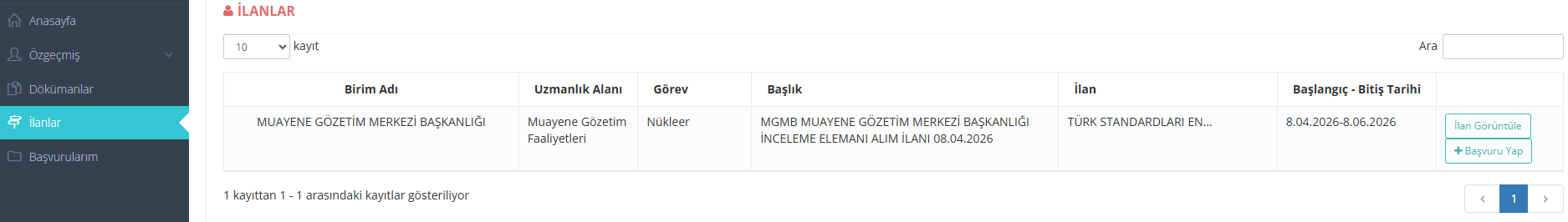 Yukarıda belirtilen yetkinlikleri karşılayan adaylar, başvurularını 08.04.2026-08.06.2026 tarihleri arasında, http://aday.tse.org.tr adresi üzerinden PDF formatında detaylı özgeçmişlerini ve yetkinliklerine ilişkin kanıt dokümanları da sisteme ekleyerek başvuru yapabileceklerdir. Adayların, sistemde yer alan bütün bilgileri doğru ve eksiksiz doldurmaları gerekmektedir. Adaylar özgeçmişini oluşturduktan sonra “İlanlar” bölümünden uzmanlık alanı “Muayene Gözetim Faaliyetleri” olan ilanın “Başvuru Yap” sekmesini seçerek aşağıda gösterildiği gibi başvurularını gerçekleştirmelidirler.